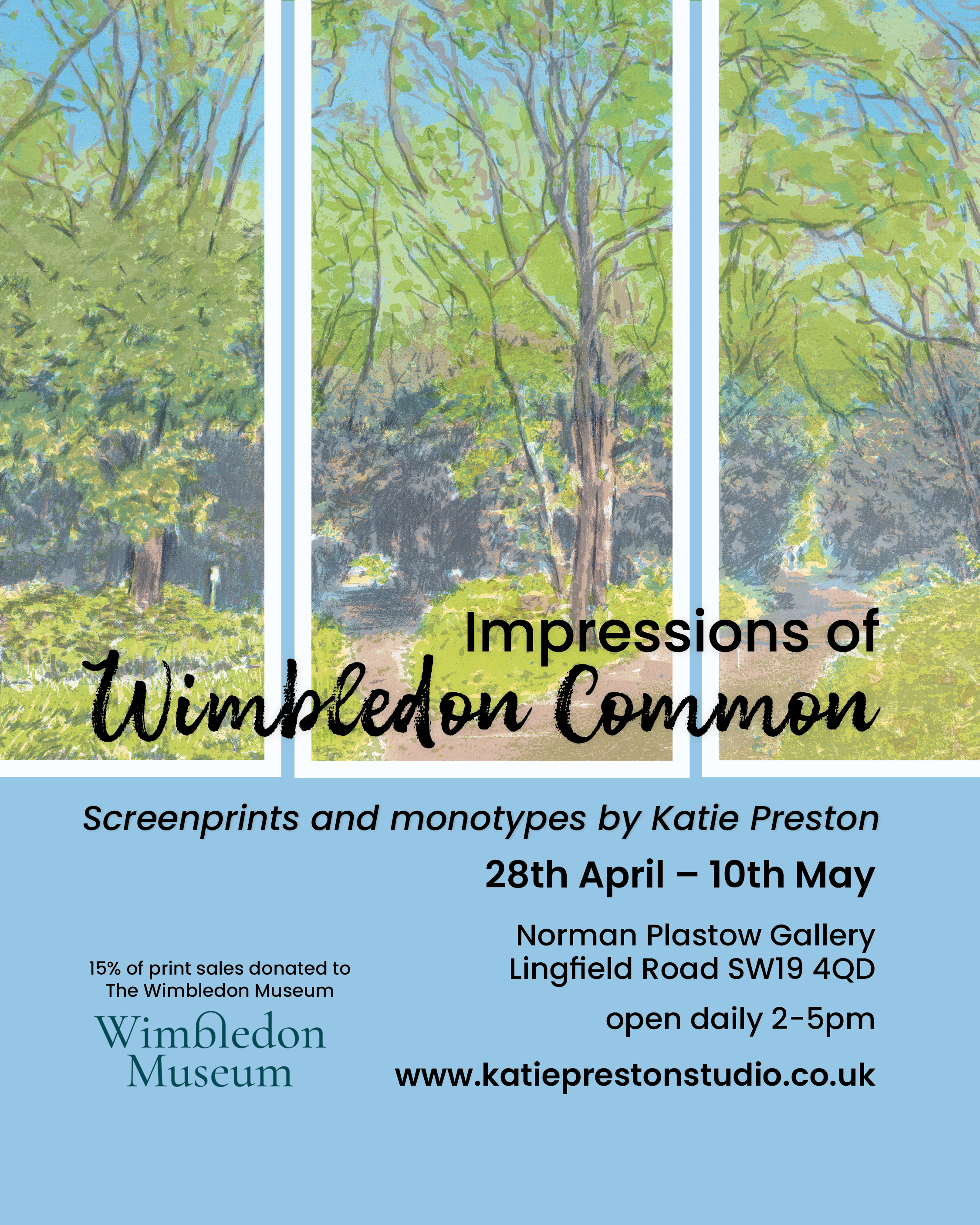 Printmaker Katie Preston brings the beauty of Wimbledon Common to life in a vibrant new solo exhibition at the Norman Plastow Gallery, Wimbledon Village, from 28th April to 10th May. Through striking screenprints, expressive monotypes and lively drawings, Katie captures the Common’s shifting seasons and transforms familiar paths, ponds and trees into bold, atmospheric works of art.