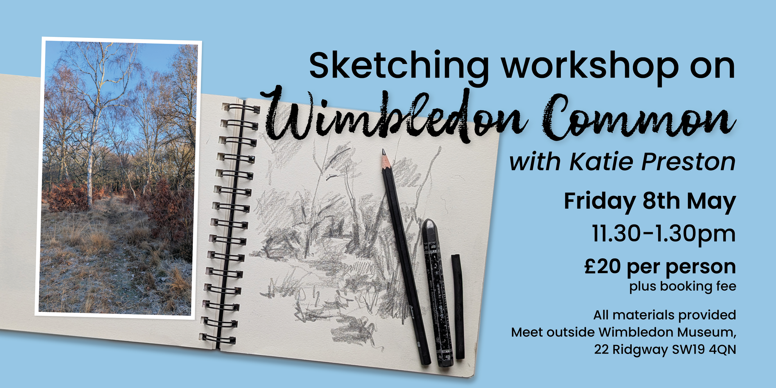 Discover the joy of spending time outside, observing and sketching beautiful Wimbledon Common. Katie will teach you some simple ways to develop your sketching potential – breaking down what you see into simple shapes and areas of dark and light – all the time focusing on the experience rather than the end results. You will be surprised by what you can achieve in two hours!